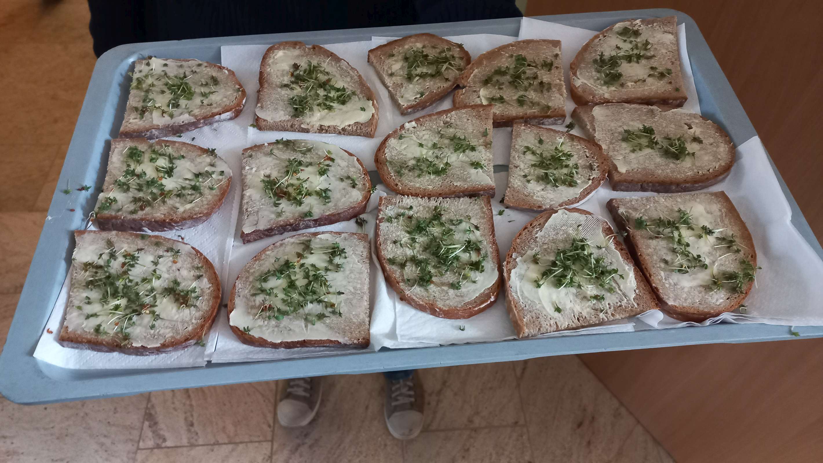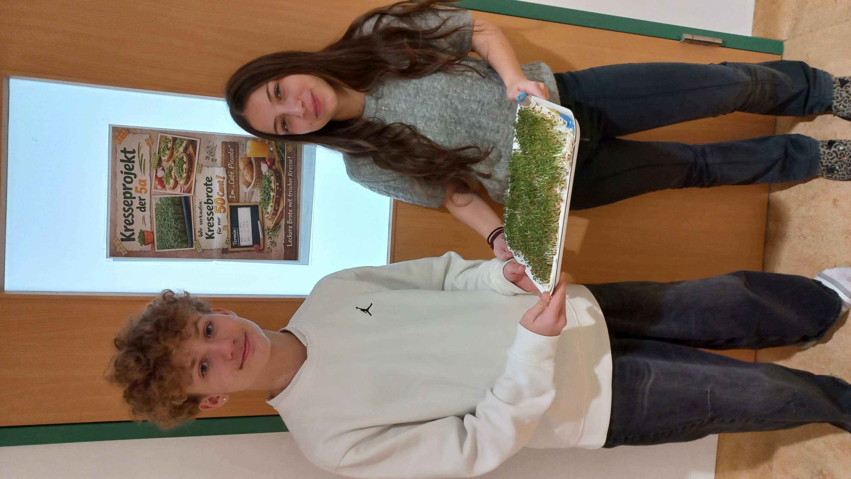 Dank der edlen Spende von sehr vielen Kressesamen von Elternseite war die Idee rasch geboren. Im Klassenzimmer der 5A wurde eine „Kresseplantage“ angebaut, die von den Schülerinnen und Schülern sorgsam gepflegt und immer ausreichend mit Wasser versorgt wurde, sodass die Kresse sehr schnell zur Ernte bereit war. Die ersten Kressebrote musste die 5A selbst verkosten, um die Produktqualität zu überprüfen. Der zweite Durchgang gelang dadurch noch professioneller, wodurch dem Verkauf der Kressebrote nichts mehr im Wege stand. Im Informatikunterricht mit Frau Prof. Ferstl kreierten die Schülerinnen und Schüler Plakate, um die Aktion für den 2., 3. und 4. März anzukündigen. Kurz vor der großen Pause schmierten sie jeden Tag Butterbrote und verzierten sie mit der Kresse. Diese gesunde Jause fand durchaus Anklang. Fast 85 € konnte die 5A mit ihren Broten einnehmen. Aufgerundet auf 100 € möchte sie damit das Don Bosco-Schulprojekt „Alle 5 Sekunden“ unterstützen.