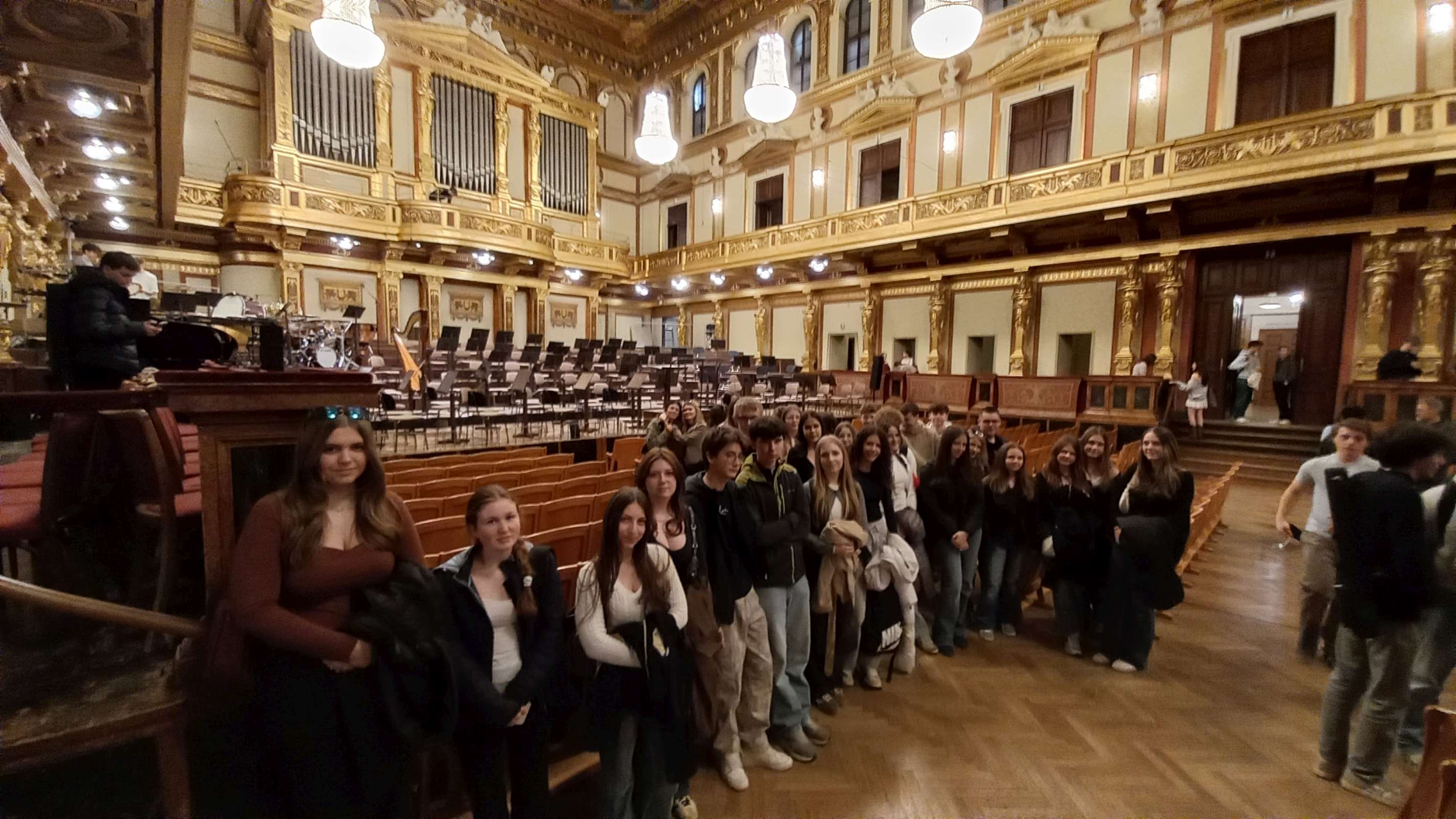 Zuerst hörten wir die Generalprobe des Musikgymnasiums Neustiftgasse im Musikverein. Nicht nur das Ambiente im Goldenen Saal, in dem jedes Jahr das Neujahrskonzert gespielt wird, begeisterte uns, sondern auch die Darbietung der gesamten Oberstufe und einiger Unterstufenklassen. Sie spielten die Symphonie Nr. 3 von Camille Sans-Saëns und Medleys aus den Musicals „My Fair Lady“ und „West Side Story“. Spannend war dabei zu beobachten, wie die finalen Proben ablaufen, und natürlich die Tatsache, dass die Künstlerinnen und Künstler auf der Bühne Schülerinnen und Schüler wie sie waren.