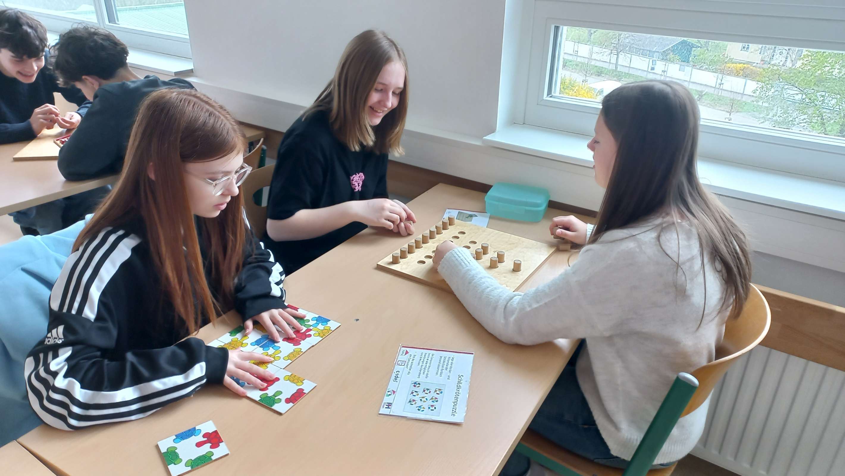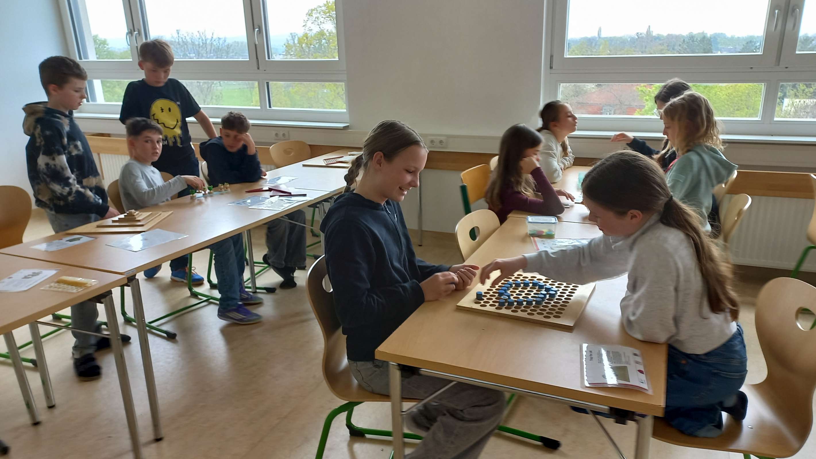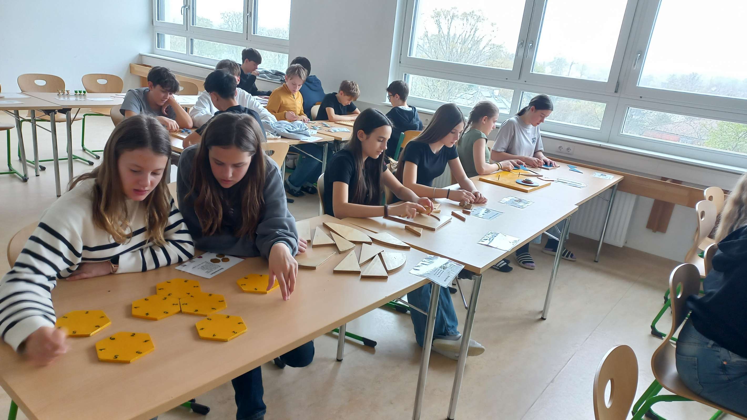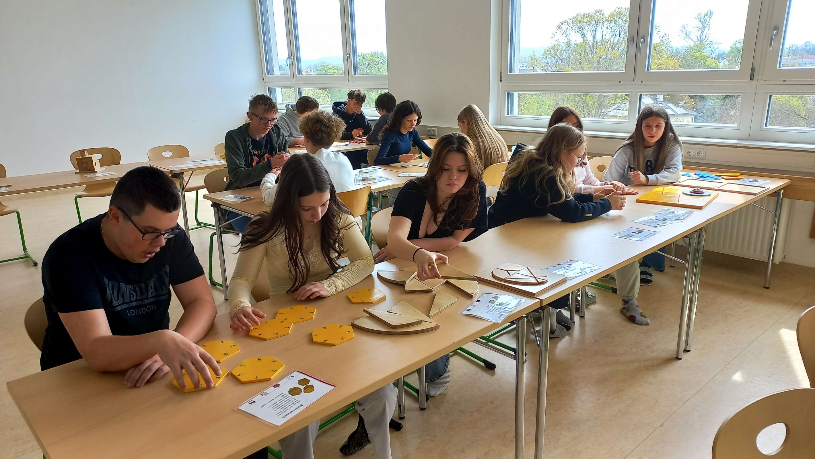Im Multifunktionsraum waren 33 Spiele und Objekte zum Ausprobieren aufgebaut, an denen die Schüler und Schülerinnen allein oder zu zweit arbeiten konnten. Die Materialien waren hauptsächlich aus Holz und sehr ansprechend gestaltet. Einerseits gab es Modelle zum Veranschaulichen mathematischer Sätze; man konnte zum Beispiel den Beweis des pythagoräischen Lehrsatzes oder die Fibonacci-Spirale nachlegen. Andererseits gab es knifflige Knobelaufgaben zum Zusammenbauen und coole Strategiespiele, deren Aufgabenstellung leicht verständlich war, aber bei denen es trotzdem nicht so einfach war, die Lösung zu finden. Es war großartig zu beobachten, wie die Schülerinnen und Schüler konzentriert Lösungsstrategien suchten, welch Durchhaltevermögen sie zeigten, wenn es nicht gleich klappte, und wie toll sie zusammengearbeitet haben.