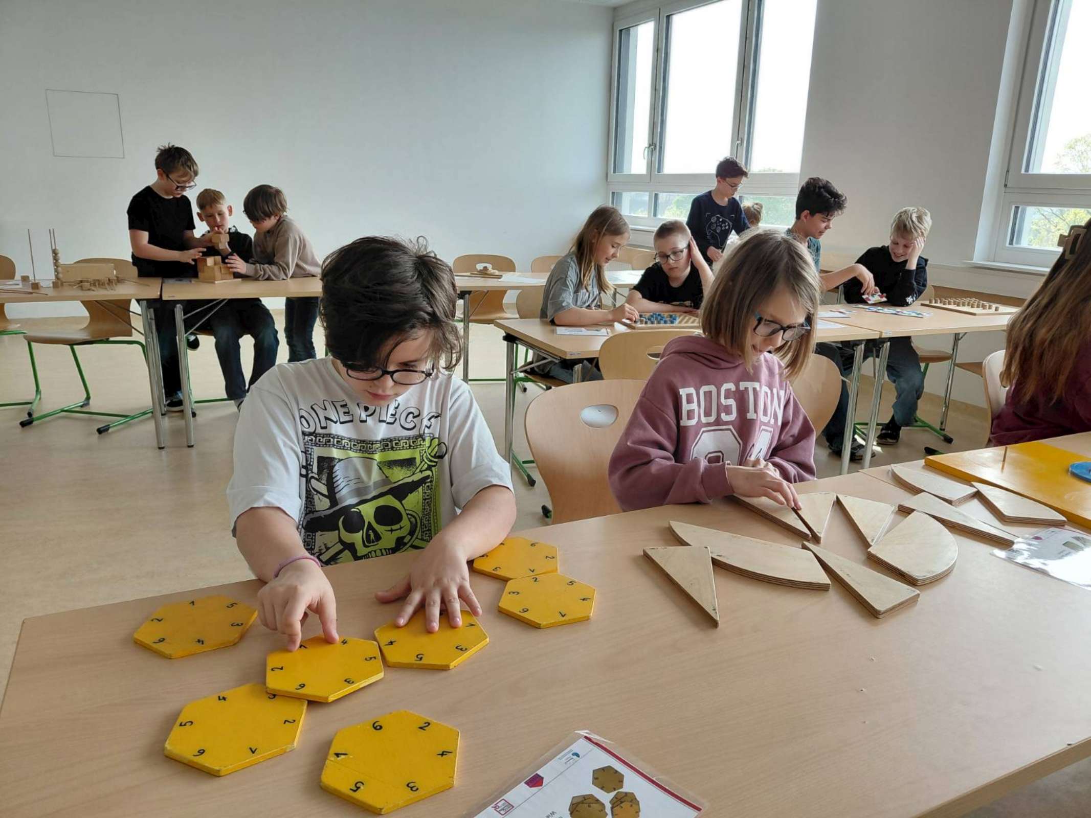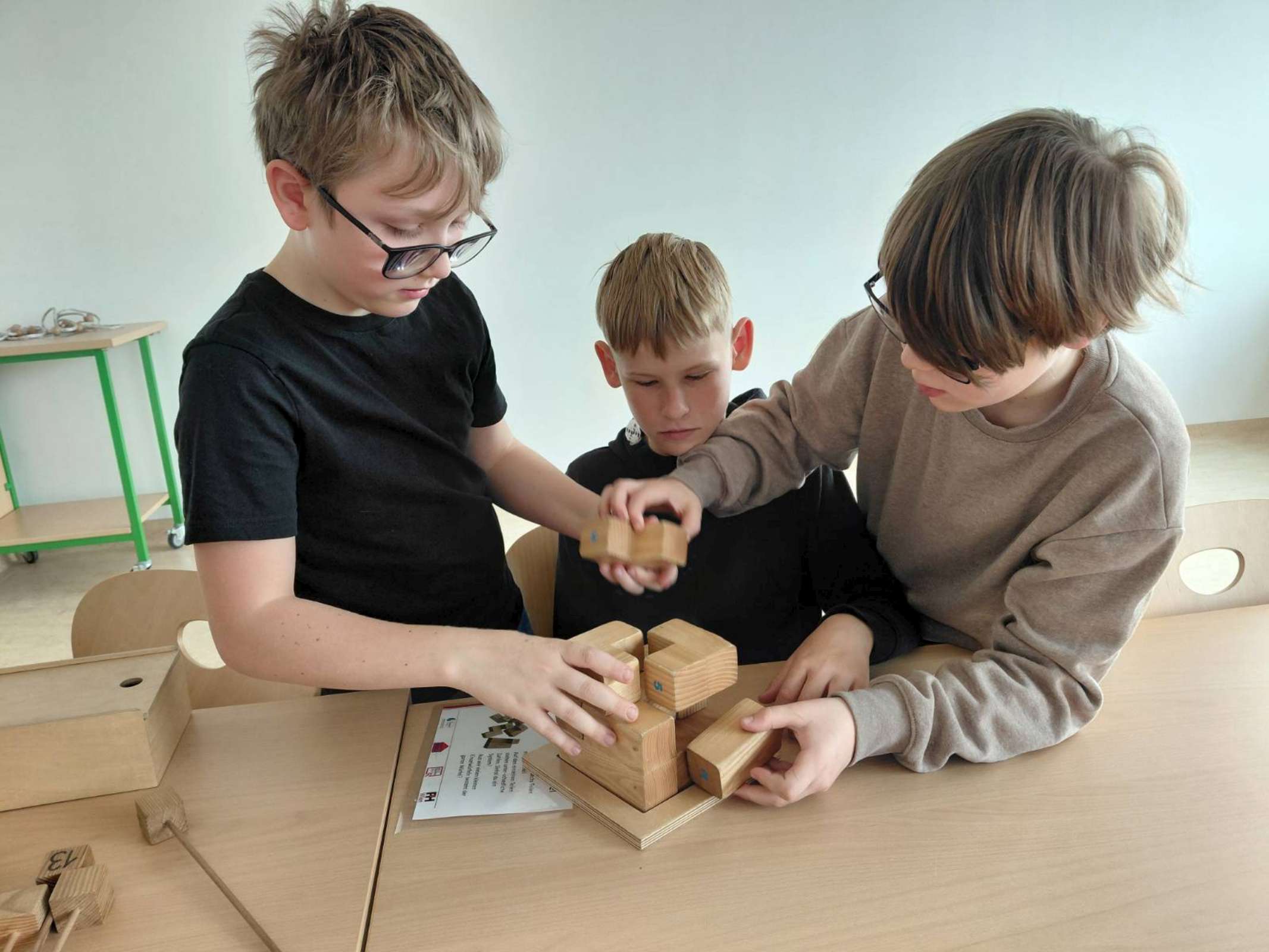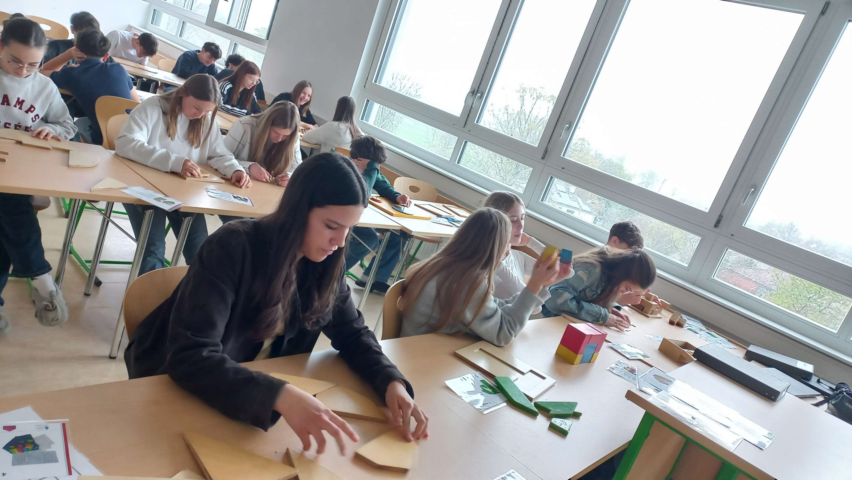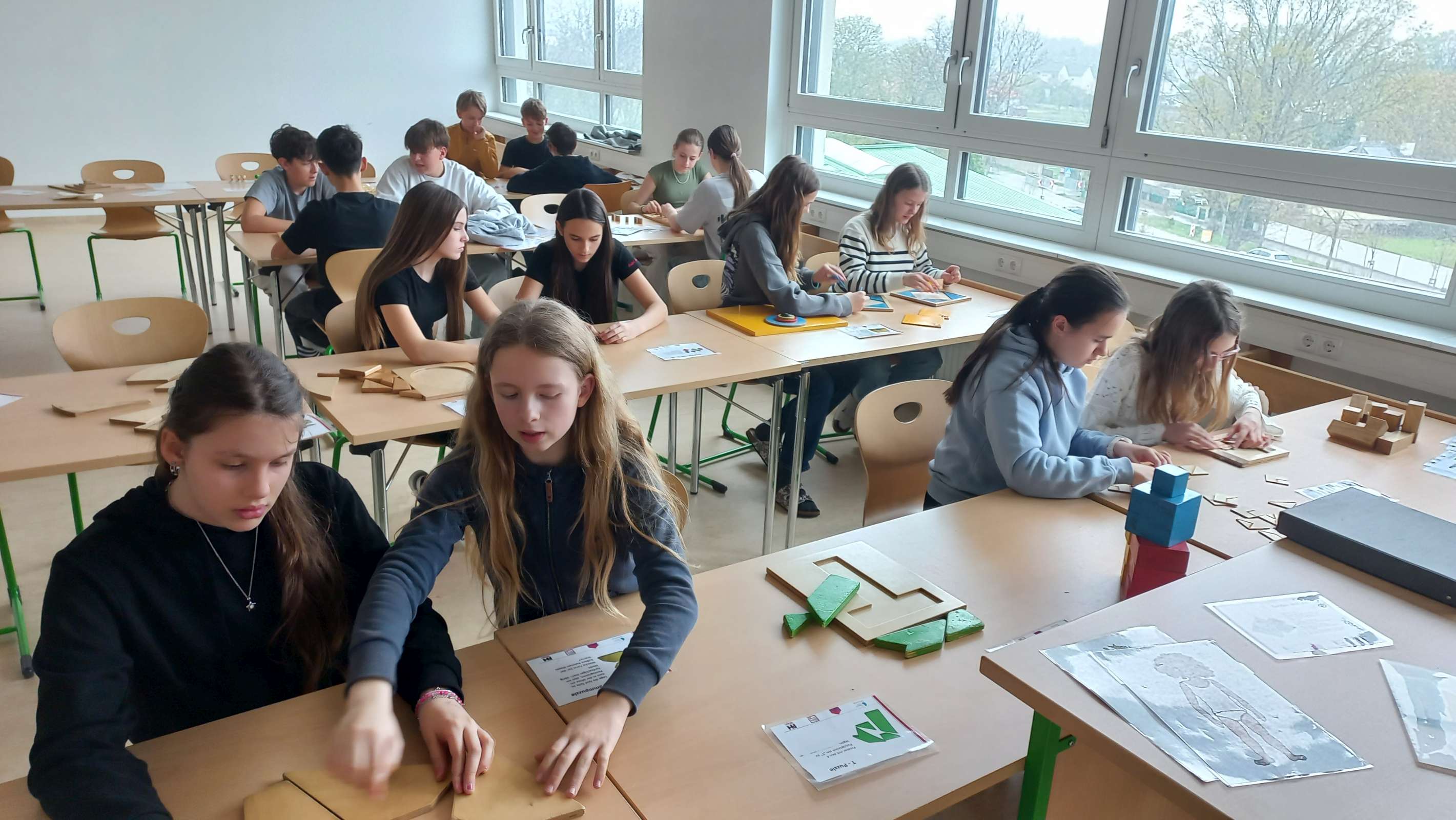 Im Multifunktionsraum waren 33 Spiele und Objekte zum Ausprobieren aufgebaut, an denen die Schüler und Schülerinnen allein oder zu zweit arbeiten konnten. Die Materialien waren hauptsächlich aus Holz und sehr ansprechend gestaltet. Einerseits gab es Modelle zum Veranschaulichen mathematischer Sätze; man konnte zum Beispiel den Beweis des pythagoräischen Lehrsatzes oder die Fibonacci-Spirale nachlegen. Andererseits gab es knifflige Knobelaufgaben zum Zusammenbauen und coole Strategiespiele, deren Aufgabenstellung leicht verständlich war, aber bei denen es trotzdem nicht so einfach war, die Lösung zu finden. Es war großartig zu beobachten, wie die Schülerinnen und Schüler konzentriert Lösungsstrategien suchten, welch Durchhaltevermögen sie zeigten, wenn es nicht gleich klappte, und wie toll sie zusammengearbeitet haben.
