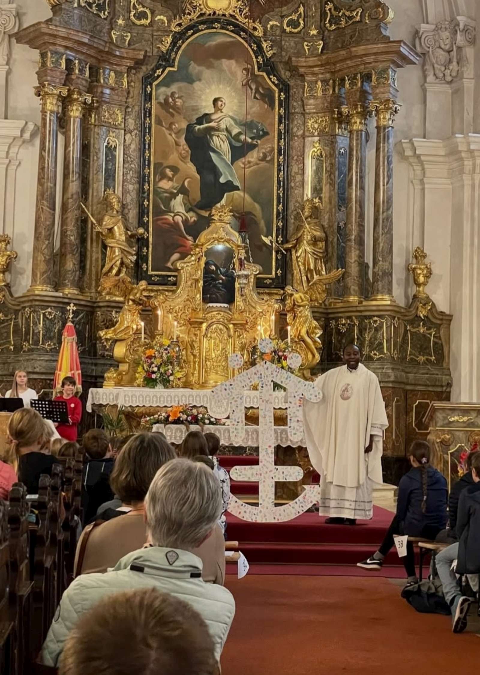 In der Basilika wurden die Jugendlichen und Lehrer/-innen von Pater Stefan Vukits, dem Pfarrer von Loretto, begrüßt. Nach einleitenden Worten von Hausdirektor Pater Rudi Osanger SDB feierten sie mit Pater Simplice Tchoungang SDB den Gottesdienst. Im Zentrum der Messen stand der Anker, der Christus ist, und an den wir unser „Leben anbinden“. Visualisiert wurde dieser Gedanke durch eine Skulptur, bunt verziert mit den Fingerabdrücken der Schüler/-innen und ihrer Lehrer/-innen. Beim Betreten der Basilika hatte jede/r ein Band mit einem kleinen Anhänger in Form eines Ankers erhalten. Dieses tauschten während der Messe je zwei Schüler/-innen, gemeinsam mit einem positiven Gedanken, aus.