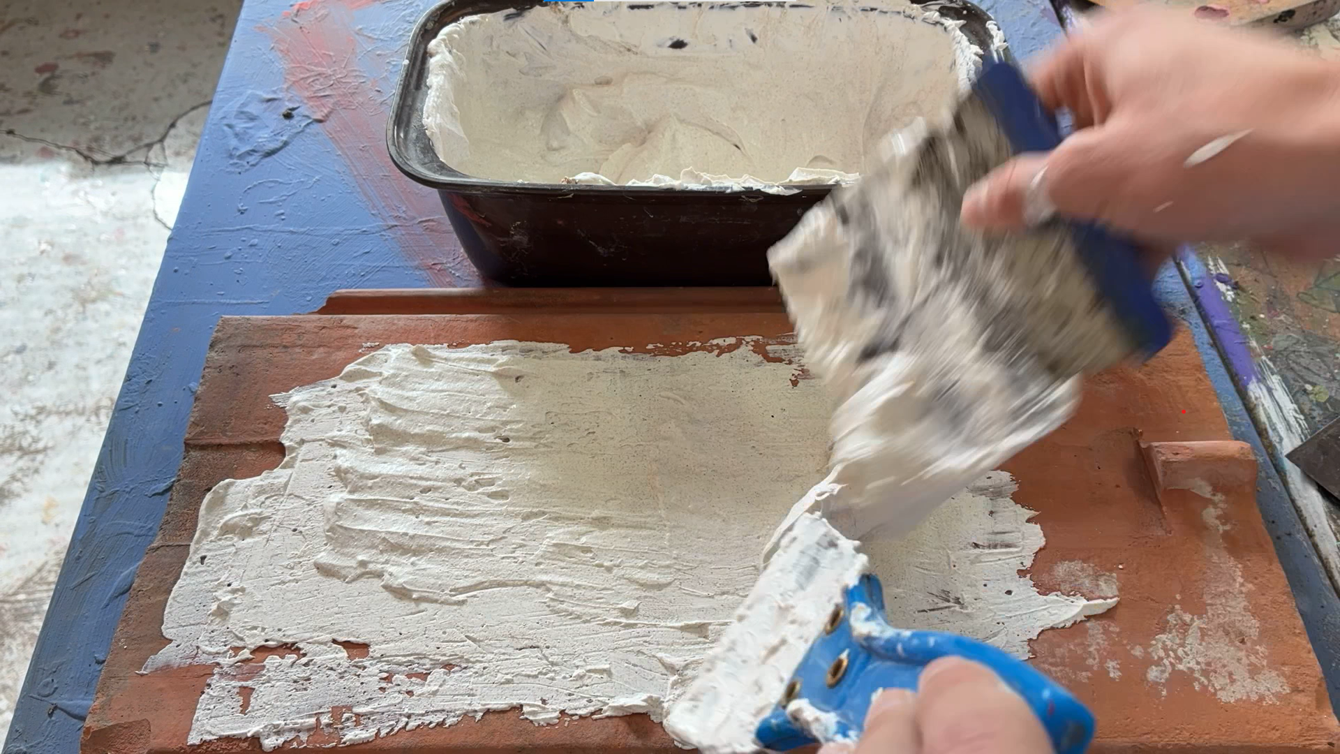 Mit der Expertise von Fresko-Urgestein Prof. Christian Rausch und viel Ehrgeiz konnte es auch schon losgehen. Dabei wurde uns schnell bewusst, wie viel Arbeit die Anfertigung auch eines kleinen Werkes wirklich bedeutet. Von Putz anrühren und verstreichen bis zur Herstellung eigener Farbe musste alles in sorgfältiger Handarbeit erledigt werden. Alte Dachziegel dienten dabei als Grundlage unserer Fresken. Zusammen mit unserer KUGE-Lehrerin Prof. Radatz ging es für uns dann endlich ans Malen. In den nächsten zwei Stunden folgte Pinselstrich auf Pinselstrich, um die Werke so perfekt wie möglich zu machen.