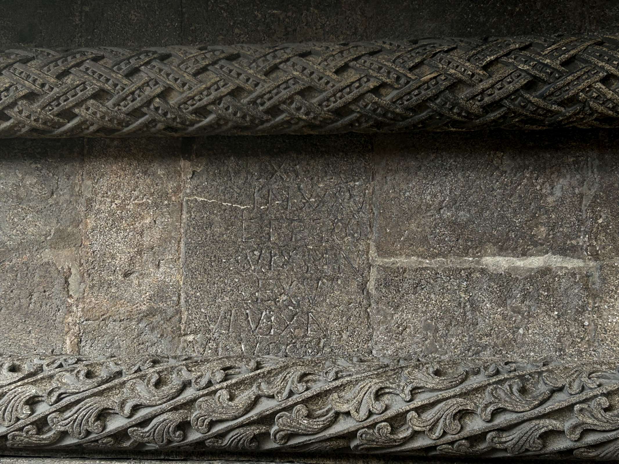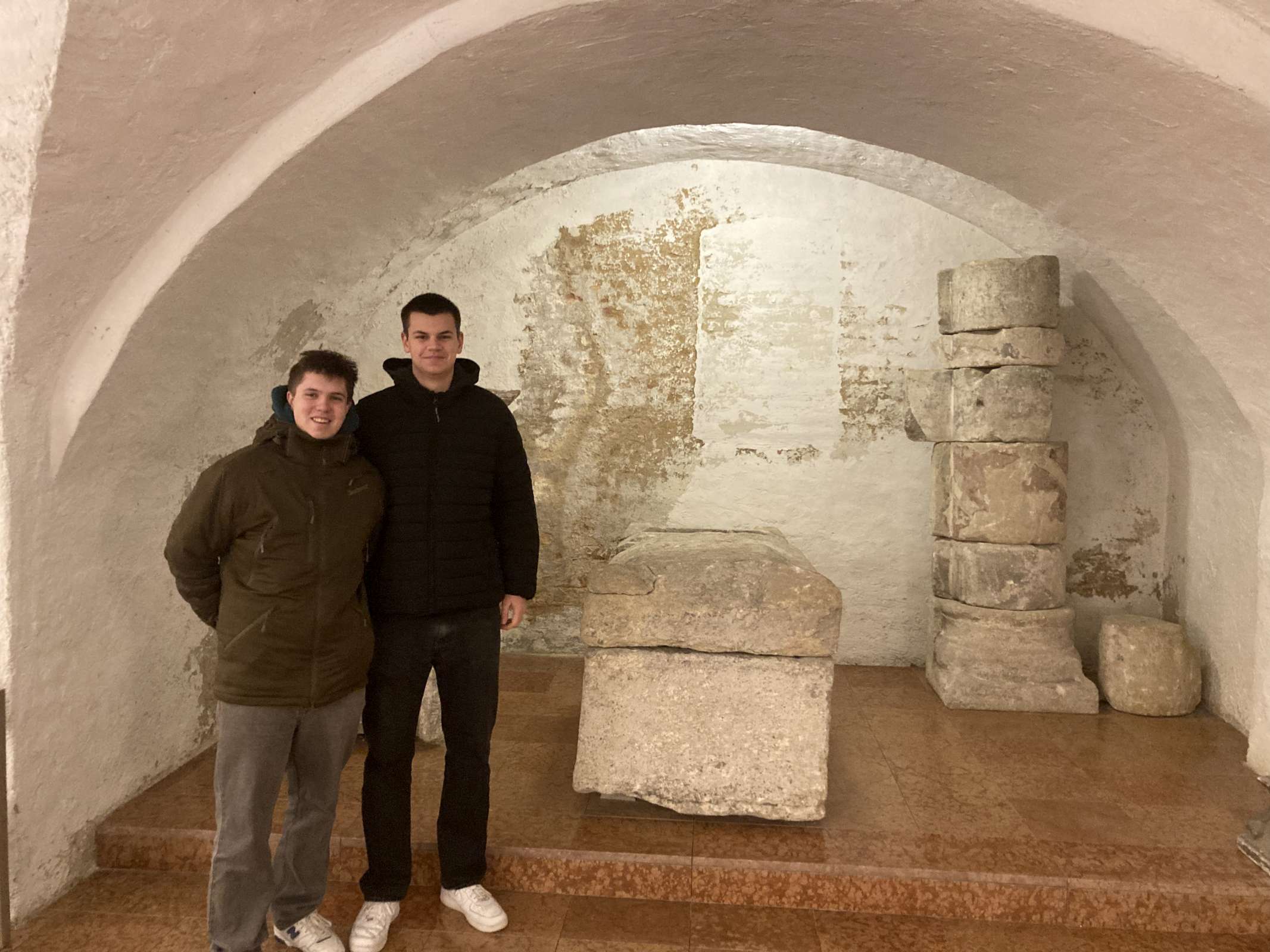 Danach gaben Tim Pointinger und Angelie Agrebi (8a) in einem Kurzreferat einen Überblick über die Geschichte des Legionslagers, bevor unsere Schüler bei eisigen Temperaturen in Gruppen ausschwärmten, um die Spuren des Legionslagers in der heutigen Stadt zu erkunden und fotografisch zu dokumentieren. Gefunden wurden u.a. Inschriften, freistehende Quader der Lagertherme und in Häusern verbaute der Lagermauer (Stoß im Himmel/Salvatorgasse); Schließlich nach Überquerung der Hohen Brücke, unter der einst im Tiefen Graben der Ottakringer Bach floss, in der Wipplingerstraße im Keller eines Einrichtungshauses das Grab eines Römers, das einst knapp außerhalb der Lagermauer gelegen war und in situ belassen wurde.