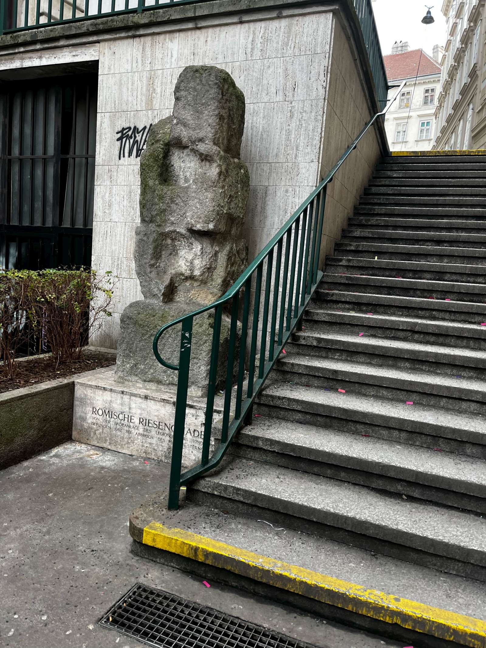 Wir trafen uns vor dem Schottenstift, in dessen Bereich um 85 n. Chr. die Römer ein Alenkastell errichtet hatten, das vermutlich dem Schutz der Bauvexillation des Legionslagers diente. Auf die Umwidmung des Raumes als Gräberfeld in spätrömischer Zeit deuten ein im Jahr 1830 beim Neubau des südlichen Traktes des Schottenstifts ausgegrabener Sarkophag, der später im Stiftsgarten aufgestellt wurde. 1969 wurde der Sarkophag zerlegt und in der Gruft des Schottenstiftes neben einer Säule eines Grabbaues neu aufgestellt.