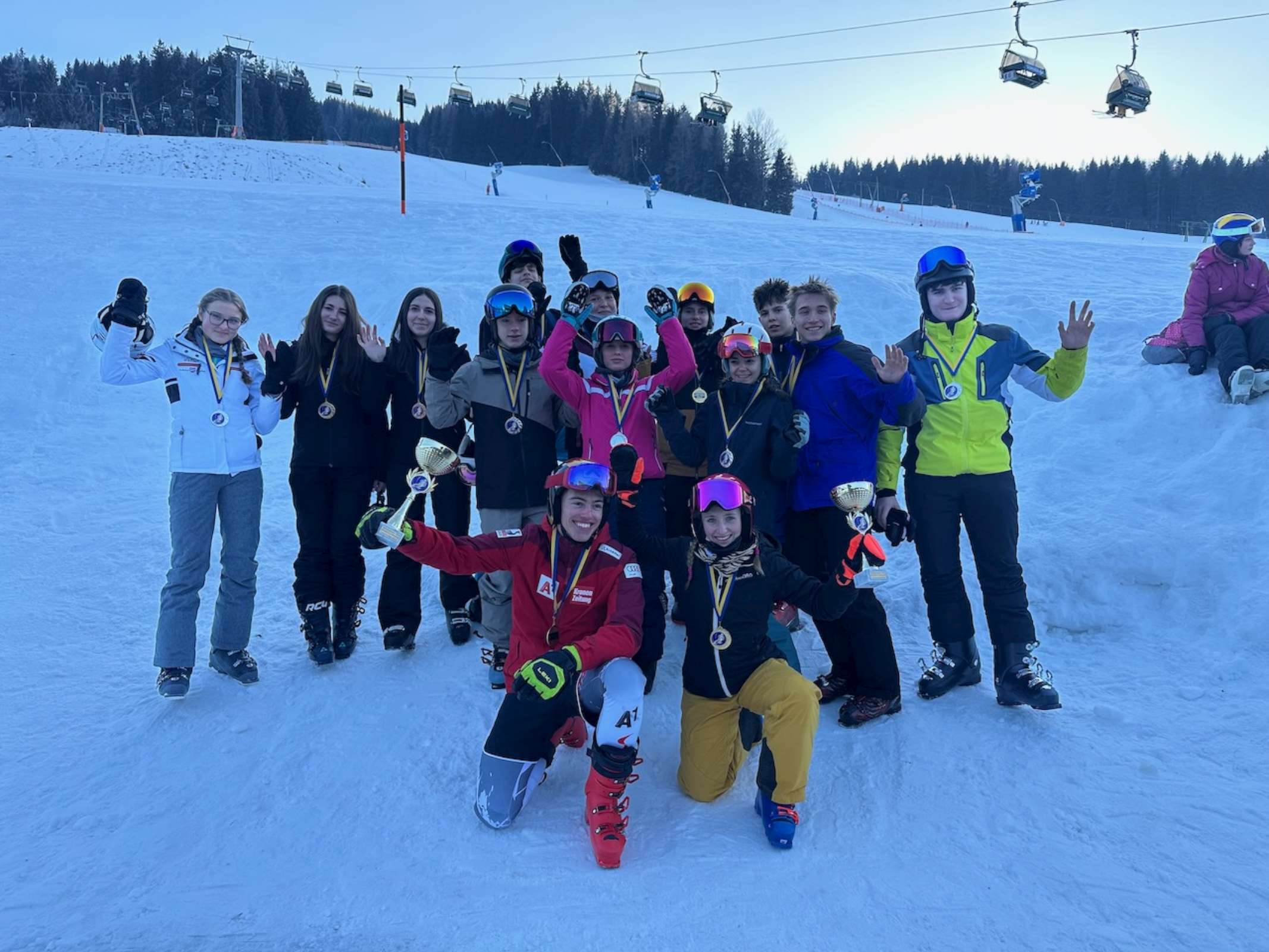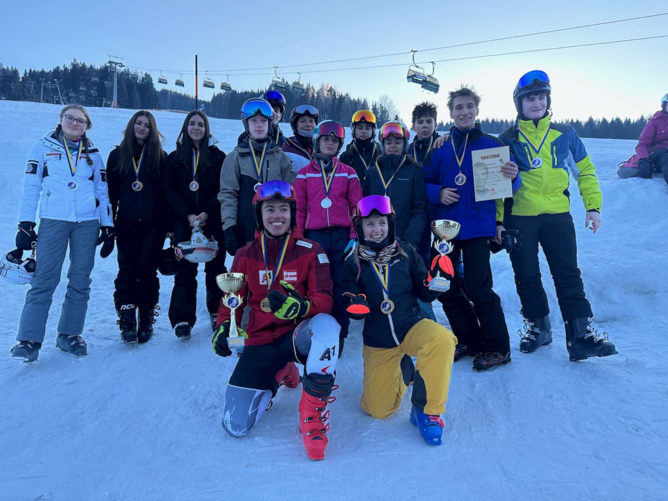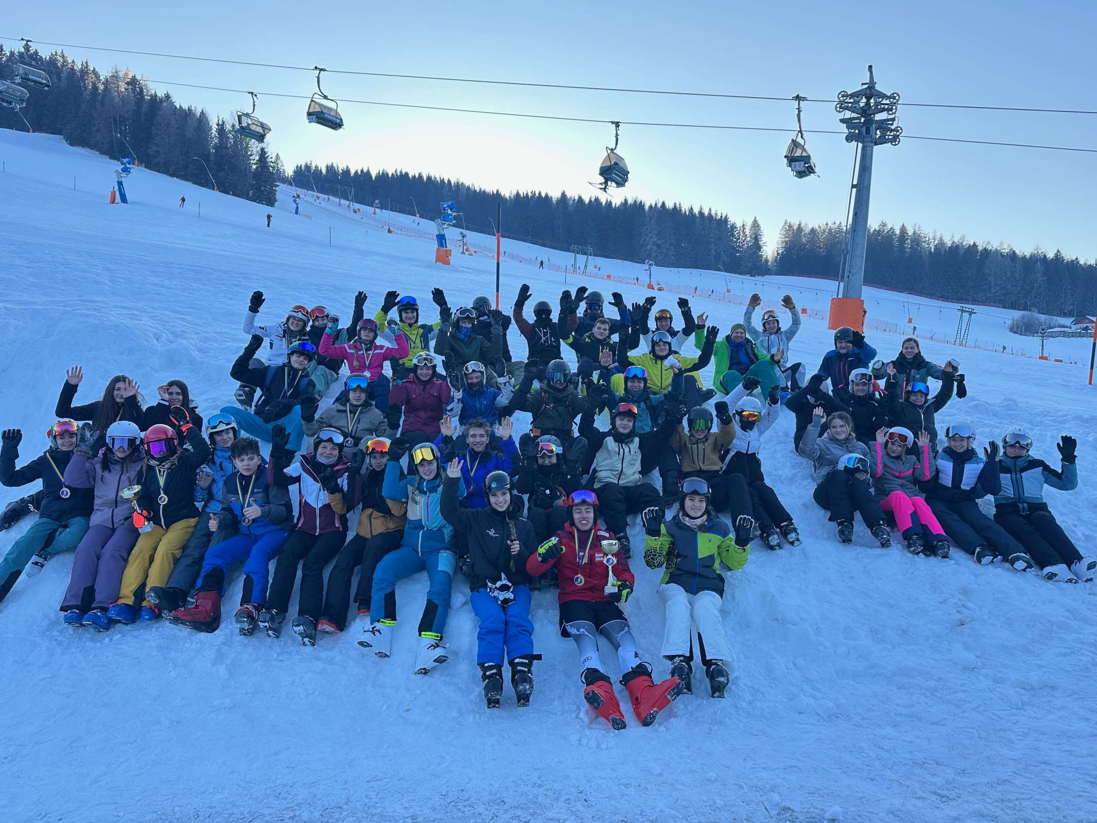 Noch vor Sonnenaufgang brachen wir mit dem Bus, dessen Finanzierung dankenswerterweise der Elternverein übernimmt, aufs Stuhleck auf. Nach einem kurzen Einfahren, Startnummernausgabe und der Besichtigung der eigens für uns gesteckten Rennstrecke ging es auch schon mit dem Rennen los. Bei besten Schnee- und Pistenbedingungen lieferten sich SchülerInnen aus allen Oberstufenklassen einen spannenden und hochkarätigen Wettkampf in zwei Durchgängen, bevor es zum wohlverdienten Mittagessen ins Alpengasthaus direkt neben der Piste ging. Am Nachmittag durften die SchülerInnen in Kleingruppen das Skigebiet erkunden und noch einige Pistenkilometer zurücklegen. Bei der abschließenden Siegerehrung ließen wir einen erfolgreichen Renntag ausklingen. Die schnellsten Zeiten des Tages brachten Heidi Csida mit 34,22 s und Tim Pointinger mit 30,99 s ins Ziel, die sich damit zur Skimeisterin bzw. zum Skimeister krönten.